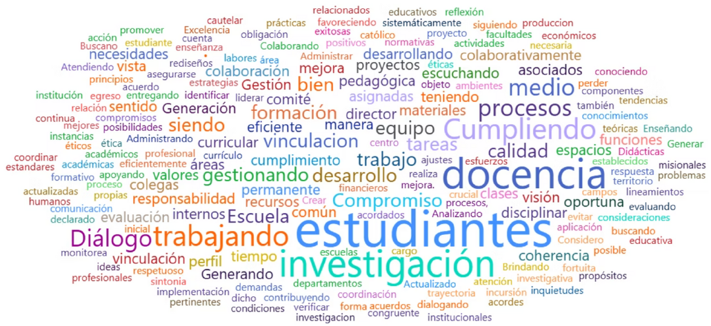 El resultado del taller constituye una síntesis que refleja cómo la comunidad académica, desde sus funciones cotidianas, contribuye de manera concreta y significativa al fortalecimiento de la calidad educativa y al cumplimiento del Proyecto Educativo Institucional, integrando las opiniones de las y los participantes y representándolas en una nube de palabras, junto con aspectos relevantes organizados por temáticas y rol, que expresan la riqueza y diversidad de miradas compartidas durante el encuentro.